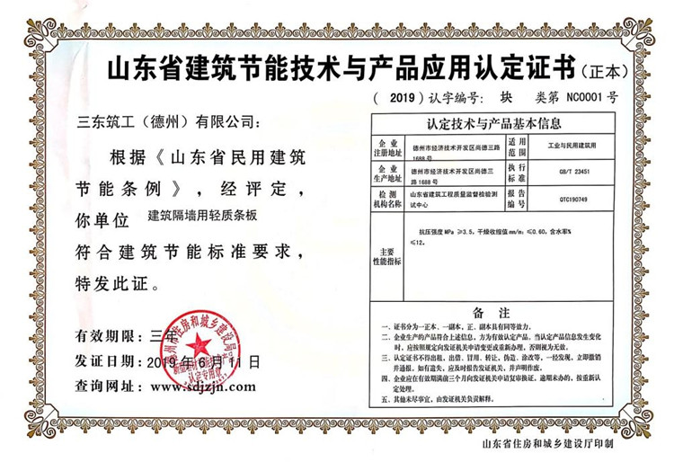 三東筑工喜獲《山東省建筑節能技術與產品應用認定證書》