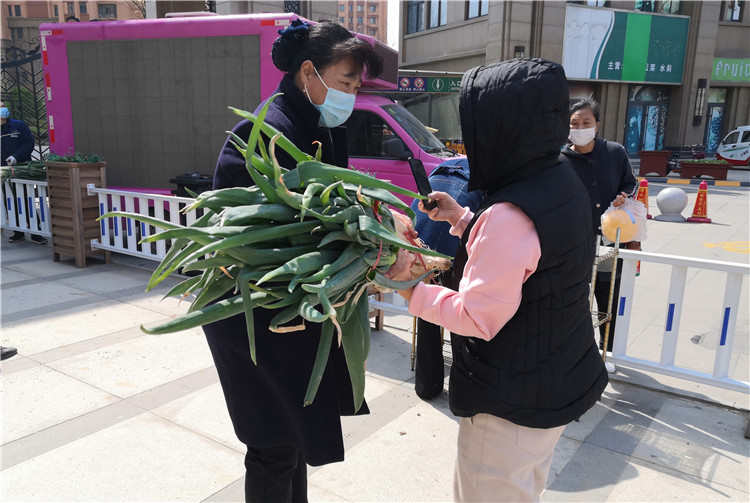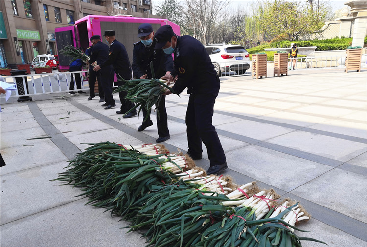 3月29日上午,一輛滿載的送貨車停靠在香港城1號門入口處,車上是業主們團購的2600斤新鮮大蔥。香港城物業的工作人員按照業主樓號和團購數量有序的搬運碼放在門口空地上,由管家通知業主們前來領取。