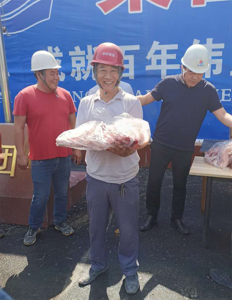 為感謝分包單位的積極配合,封頂儀式結束后,301項目部項目經理張宜灝為五家勞務家庭每家發放一箱雞蛋、一只豬腿作為鼓勵,感謝他們在這段艱難時期與東海集團共進退。